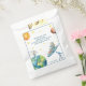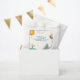 This adorable party favor treat bag features a teddy bear coming in for a landing on Earth. A satellite system is on the earth's surface and in the corner is a telescope. The sun is shining brightly in the sky and another planet is off to the side. Stars are twinkling all around him. There's a template for you to enter the date of the baby shower. The collection includes everything you need for a completely coordinated fun baby shower for your new little one.