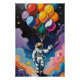 An astronaut, walking in the vastness of space, waves cheerfully while attached to a bunch of vibrant, colorful balloons. The backdrop bursts with a kaleidoscope of celestial hues, adding a whimsical contrast to the serene expanse of the universe.