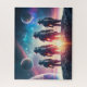 Illustration of astronauts in spacesuits standing on surface of alien planet staring into space at other planets in deep space .