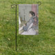 Flag bracket is super easy to assemble. There is a prong fork that goes into the ground. I dug a shallow hole to bury the prongs and still had enough height. Reinforced stitching on for the flag opening. Colors are true to the website. Mona Lisa's sign with the text is easy to read, the text is clear and not blurry.