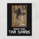 A duck mount featuring an oiled, dead Mallard duck, earth moving equipment, and a skull and crossbones. Text reading "STOP THE TAR SANDS" also appears. Woe to any waterfowl landing in a toxic tailings pond in Alberta where a extremely viscous petroleum is extracted from tar sands (aka oil sands) with horrible environmental effects. The Alberta tar sands consist of heavy crude oil mixed with sand, clay and bitumen. Extraction entails burning natural gas to generate enough heat and steam to melt the oil out of the sand. As many as five barrels of water are needed to produce a single barrel of oil. Every day millions of gallons of water are contaminated with chemicals, including arsenic, copper, lead and zinc, to basically separate tar sands oil (called diluted bitumen) from the sand. But the water is so contaminated after this process that they have to store it in toxic sludge pits called tailings ponds. It is estimated that 3 millions gallons of contaminated water leaks from tailing ponds into Alberta's Athabasca River, and the surrounding landscape, every day. Please say no to tar sands.