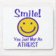 Put a human face on Atheism with a bright yellow face outlined in blue with blue letters that says: "Smile! You just met an ATHEIST."