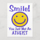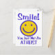 Put a human face on Atheism with a bright yellow face outlined in blue with blue letters that says: "Smile! You just met an ATHEIST."