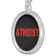 A NECKLESS PENDENT WITH THE WORD "ATHEIST" IN RED ON A BLUE BACKGROUND