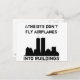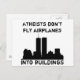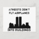 Picture of the world trade center twin towers before the attack on september eleventh (911 nine eleven 9 11) with the caption "atheists don't fly airplanes into buildings. On september eleventh, the world trade center was ruthlessly destroyed. Not by a government or a mad scientist or even someone with financial motivations. It was destroyed by a fundamentalist religious group. Nine Eleven was a faith based initiative. Fundamentalist islamic muslims murdered thousands of american citizens in cold blood in the name of god. Funny then that atheists are the nations least trusted minority. Especially so when considering that atheists don't fly airplanes into buildings.
