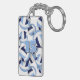 This volleyball themed keychain features the image of a bunch of varied size light blue, navy and white volleyballs and can be personalized with the athlete's name on the front and jersey number or monogram on the back - by katz_d_zynes