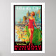 Vintage railroad travel poster promoting Atlantic City as a resort destination featuring a bathing beauty on the beach with boardwalk and hotels in the background.