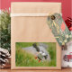Rectangular photo sticker of an atlantic puffin bird flying with spread wings before landing at the island of Runde at the Atlantic coast of Norway.