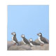 Puffins at rest on the rocks. The Atlantic Puffin (Fratercula arctica) feeds primarily by diving in the water. They breed in large colonies on coastal cliffs or offshore islands in the North Atlantic. Puffins shed the colorful outer parts of their bills after the breeding season, leaving a smaller and duller beak. Their short wings are adapted for swimming with a flying technique under water. In the air, they beat their wings rapidly (up to 400 times per minute) in swift flight, often flying low over the ocean's surface.