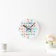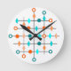 This wall clock has mid-century modern design of a grid in black lines with orange and teal circles and diamonds.
