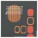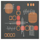 A mid century modern abstract art design that would have fit right in during the 1950s. Various shapes of oval circles and lines in burnt orange and orange red against a black background.
