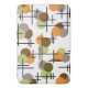 A retro atomic era inspired pattern with brown, orange, gray and chartreuse molecule circles, along with mid century modern styled bold lines.