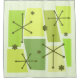 This 1950s midcentury modern vintage abstract art has wonky geometric rectangles with lines that make sputnik starbursts. Colors are shades of light yellow-green.