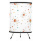 Add a pop of color to your end table with this funky atomic starburst and polka dots pattern table lamp. It features the colors of turquoise blue, burnt orange, tan, yellow, and dark gray. It's a great way to add a little fun to your decor!