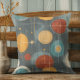 This mid-century modern circle design brings a bold, vintage-inspired statement to a decorative throw pillow. Set against a soft greige background, the pillow features a large-scale, all-over pattern of retro circular motifs in a warm and stylish palette of rust, teal, mustard yellow, and crisp white.