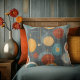The circles vary in size and style—some are solid, others outlined or filled with atomic-era patterns like concentric rings and radiating starbursts—creating a lively yet balanced look. The smooth, woven fabric enhances the clean lines and rich tones, while the oversized motifs give the pillow a graphic, eye-catching quality, perfect for modern sofas, reading nooks, or mid-century inspired interiors.