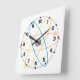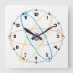Large numbers for each hour as well as lines denoting each minute. Three color "atom" fills the background