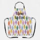This apron has a mid-century modern design of diamonds with “antenna” in them, in vintage colors of green, pink, gold, blue, and purple. If you like the design but prefer different colors, message me.
