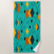 This beach towel has a mid-century modern atomic design of diamonds, and starbursts on a field of turquoise.