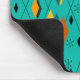 This mouse pad has a mid-century modern atomic design of diamonds, and starbursts on a field of turquoise.