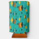 This seltzer can cooler has a mid-century modern atomic design of diamonds, and starbursts on a field of turquoise.