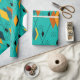 This wrapping paper has a mid-century modern atomic design of diamonds, and starbursts on a field of turquoise.