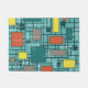 A mid century modern geometric abstract art design with lines, squares and rectangles in turquoise, teal, orange and yellow.