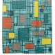 A mid century modern geometric abstract art design with lines, squares and rectangles in turquoise, teal, orange and yellow.