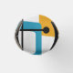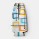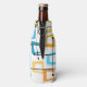 This bottle cooler has a design of rectangles that are stretched on one end in groovy colors, orange, green, teal, purple, blue, pink, and yellow with atomic lines crisscrossing them.