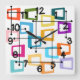 This wall clock has a design of rectangles that are stretched on one end in groovy colors, orange, green, teal, purple, blue, pink, and yellow with atomic lines crisscrossing them.