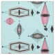 This retro Atomic Pink and Grey Pattern Fabric is so awesome it will have you saying, “I can’t believe it’s not barkcloth!” The vintage inspired design is a new take on mid century modern styles. It offers all of the fun of finding a vintage product without having to schlep through antique stores and flea markets. Just when you think it can’t get more perfect, you learn that this whimsical design with its kitschy off kilter shapes in colors of pink, charcoal grey, black, and light grey even offers the option of customizing the background color. We’ve put it on a lovely shade of aqua, but a quick change of the background color, and… Presto! Change-o! The product has gone from subdued to daring! There are dots, starbursts, and diamonds in this piece of modern art. This homage to the 1950s will thrill your retro loving soul.