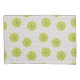This pillowcase has a mid-century modern design of tan arches repeating on white as a background with repeating green-gold circles with darker green-gold starbursts inside them.