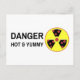Radiation hazard symbol on the order of pizza and sausage slices. Danger - Hot and Yummy text. Funny and humorous design for good mood and Halloween party.
