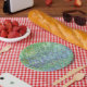 A modern take on mid-century modern : overlapping atomic shapes overlaying a digital crosshatch in bright greens and fresh blues.