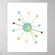 This colorful mid century modern poster features an atomic starburst in turquoise blue, avocado green, cream, and black. So fun!