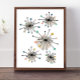 This mid-century modern artwork features shooting starbursts in the colors of turquoise blue, orange, tan, green, blue, and black. This will make a fabulous addition to your retro home decor!