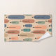 This towel set has a mid-century modern design of long ovals in peach, green, blue, teal, and light brown with black lines with circles on the ends.