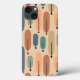 This phone case has a mid-century modern design of long ovals in peach, green, blue, teal, and light brown with black lines with circles on the ends.