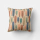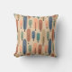 This throw pillow has a mid-century modern design of long ovals in peach, green, blue, teal, and light brown with black lines with circles on the ends.