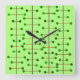 This wall clock has a mid-century modern design of black vertical lines with brown vertical lines and green circles.