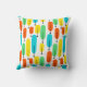 This throw pillow has a mid-century modern design of long ovals in yellow, orange, green, and turquoise with black lines with circles on the ends.