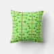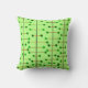 This throw pillow has a mid-century modern design of black vertical lines with brown vertical lines and green circles.