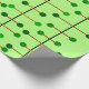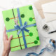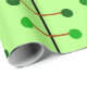 This wrapping paper has a mid-century modern design of black vertical lines with brown vertical lines and green circles.