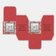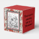 Red square classic-style favor box with a vintage black and white Alice in Wonderland image, on two sides, of Alice under attack by the Cards in a black and white checkerboard frame on a background of playing cards on red. The customizable text on the sides reads “Thank you for celebrating with me in Wonderland!" See the entire Wonderland Favor Box collection in the PARTY FAVORS section.
