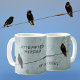 As the counting of Crows and corvids and blackbirds in based on folklore and superstition, so is the naming of a group of 3 or more Crows a "murder of crows". This beautiful, but humorous mug features two black crows at one end of a Wire and one on the other end, thus the attempted murder Viewing the mug only the 2 or the 1 crow can be seen, never the 3 at the same time. The gothic feel of the aged pale blue and brown tones adds to the mysterious and legendary appeal of the Crow. Personalize the text and Name on this beautiful mug that will appeal to any bird lover or lover of the macabre or murder mysteries or a good funny joke.