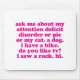 Ask me about my attention deficit disorder or pie or my cat. A dog. I have a bike. Do you like TV? I saw a rock. Hi. - Jomadado is the original & official creator of this ADD quote. Available on items for men, women & children. Various sizes and colors available for most items. Pink print.