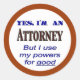 Yes I'm an Attorney, but I use my powers for good saying. Funny lawyer slogan for professionals in legal capital letters in blues and browns.
