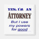 Yes I'm an Attorney, but I use my powers for good saying. Funny lawyer slogan for professionals in legal capital letters in blues and browns.