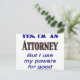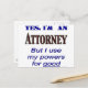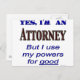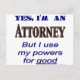Yes I'm an Attorney, but I use my powers for good saying. Funny lawyer slogan for professionals in legal capital letters in blues and browns.