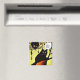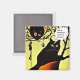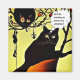 Two black cats are depicted in a whimsical composition, perched among branches with colourful fruits. One cat observes the other with a humorous thought.